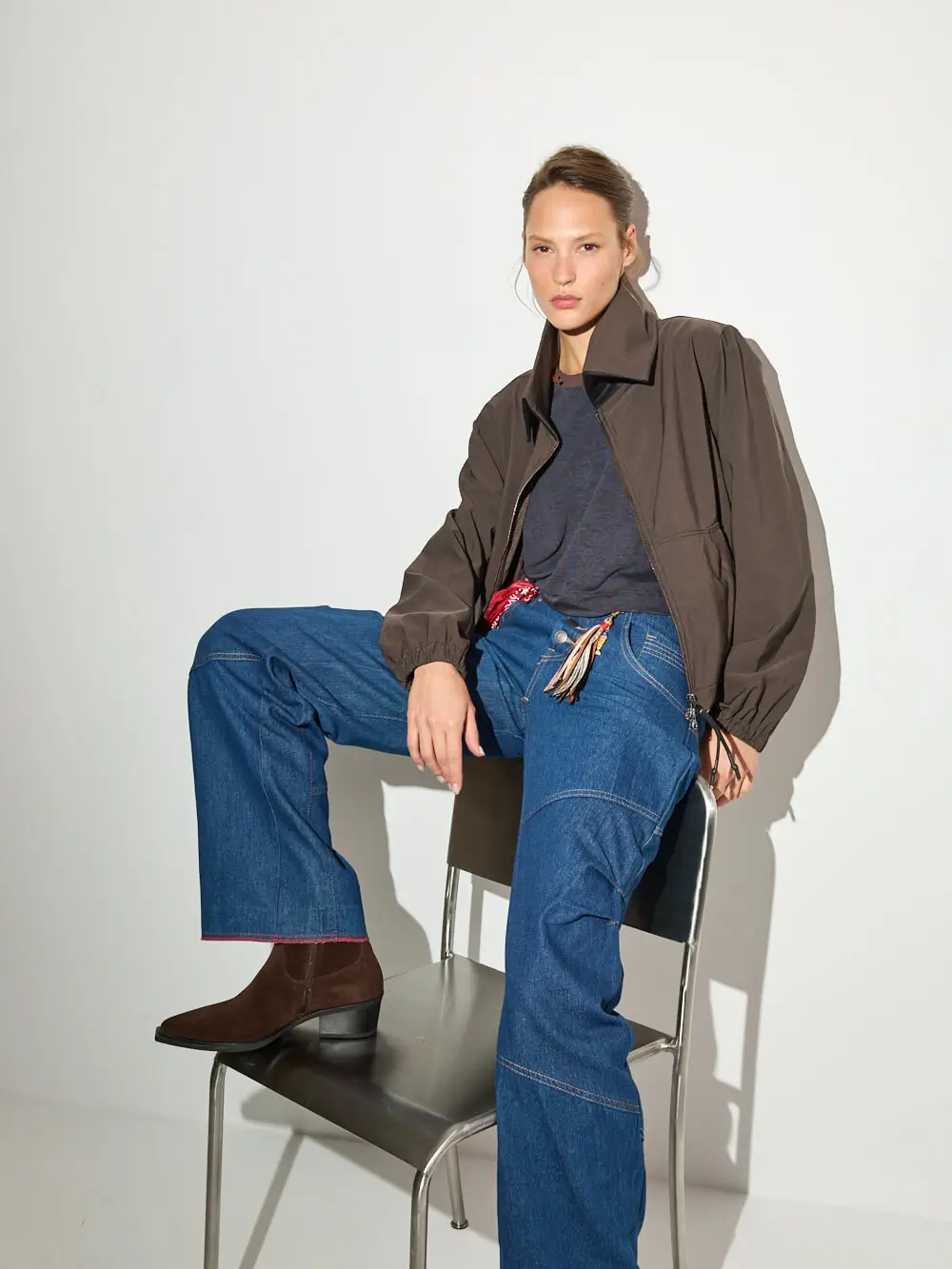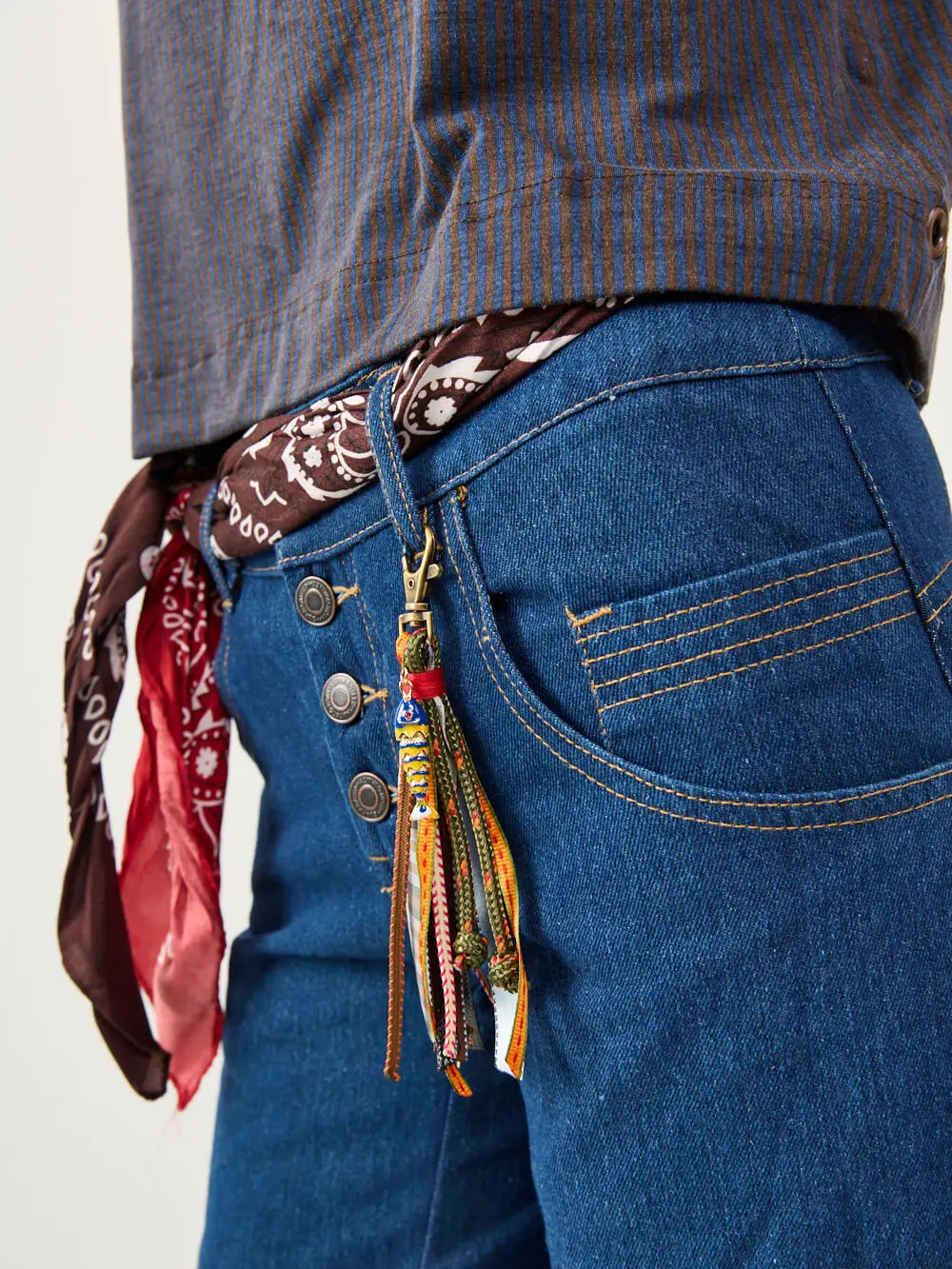 מכנסי ג׳ינס בגזרה נינוחה, מכובסים בוואש מיוחד – עם חגורת בנדנה אופנתית.