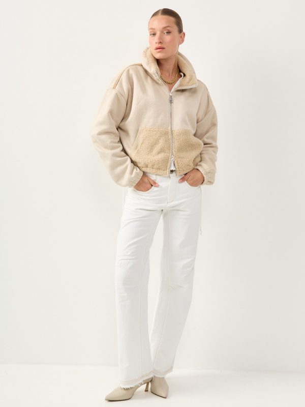 ג׳קט בוקלה רך בגזרה רחבה ונינוחה, עם צווארון גבוה וסגירת רוכסן קדמית.