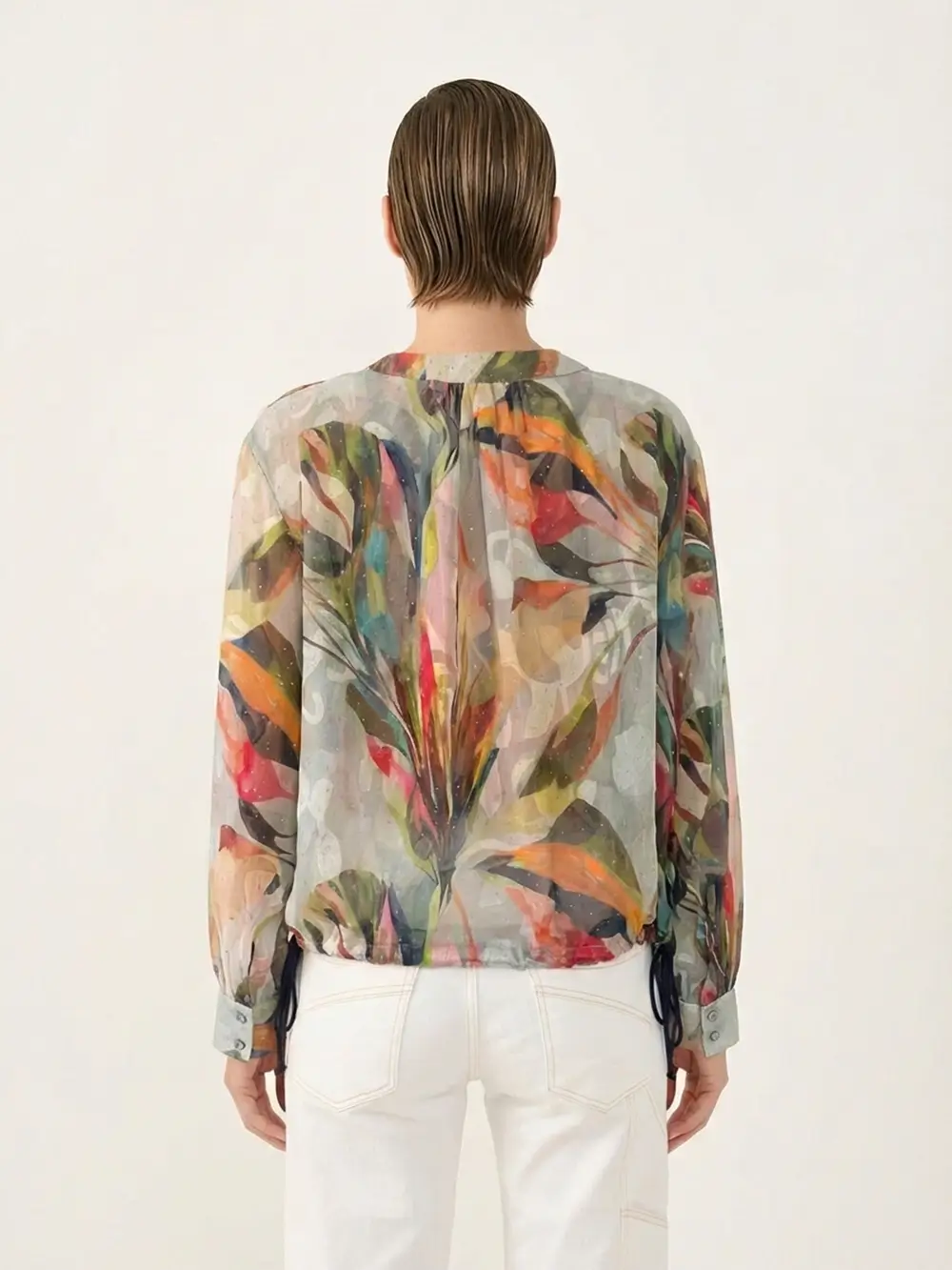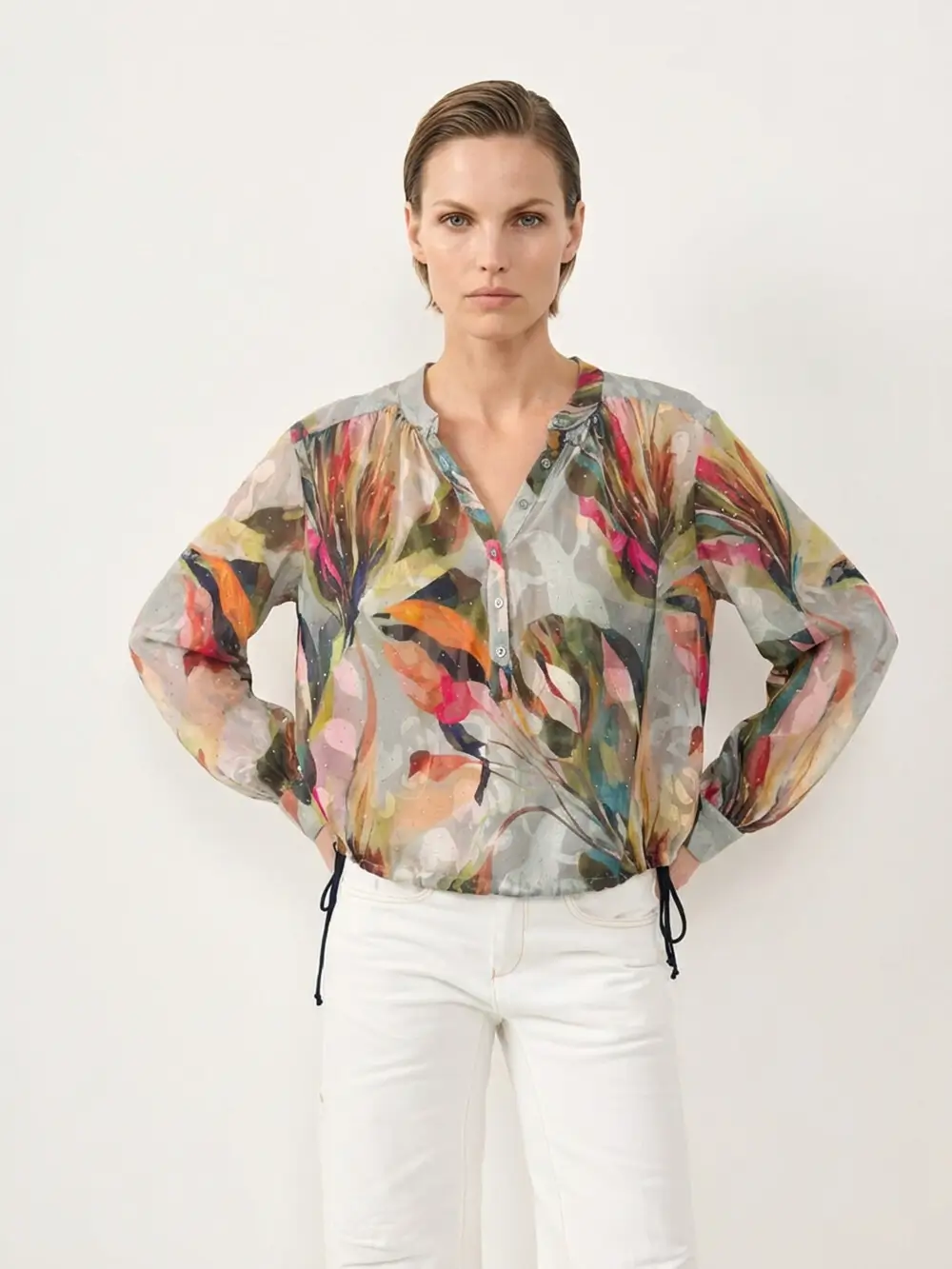 חולצת השיפון EDEN שלנו בגזרה קלאסית ורכה, עשויה מבד שיפון נשפך ועדין למגע, עם מפתח וי קליל וסגירת כפתורים חלקית.