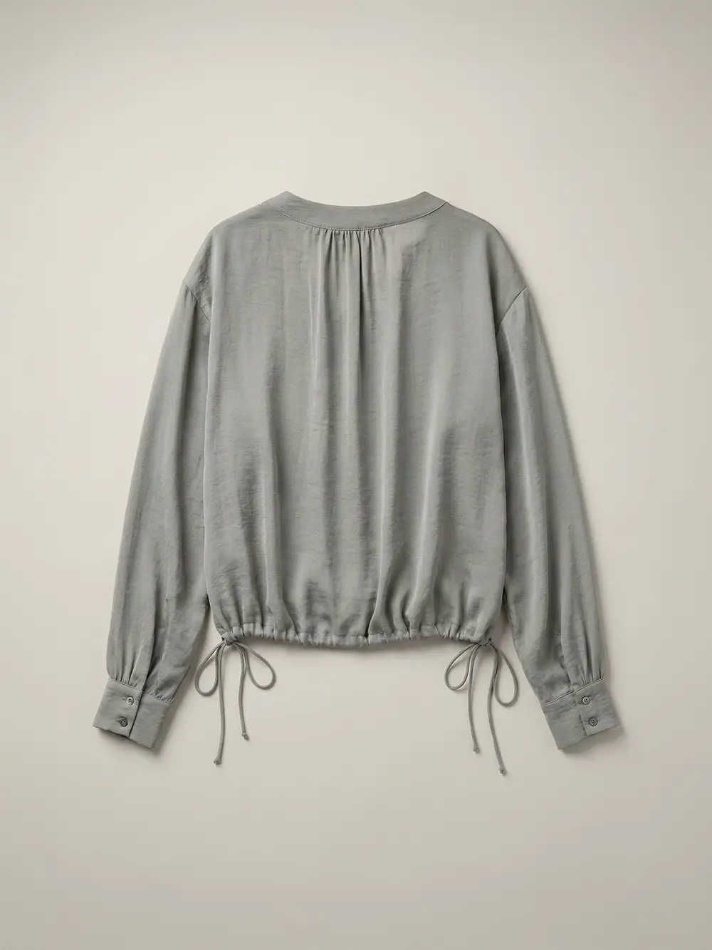 קפלים עדינים באזור הכתפיים והצווארון מוסיפים נפח עדין ונשיות, והשרוולים הארוכים מסתיימים במפתח צר עם כפתור.