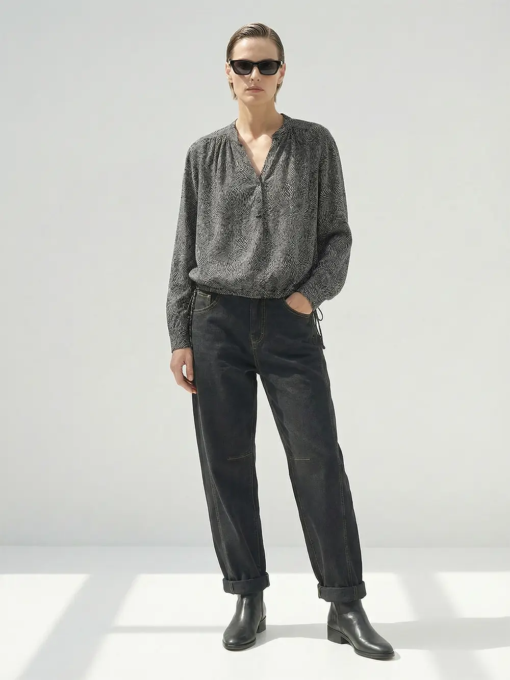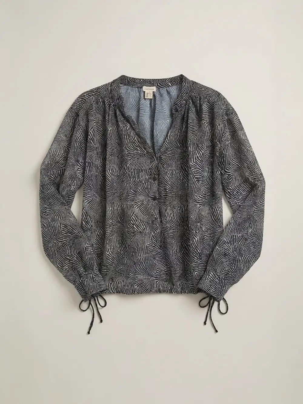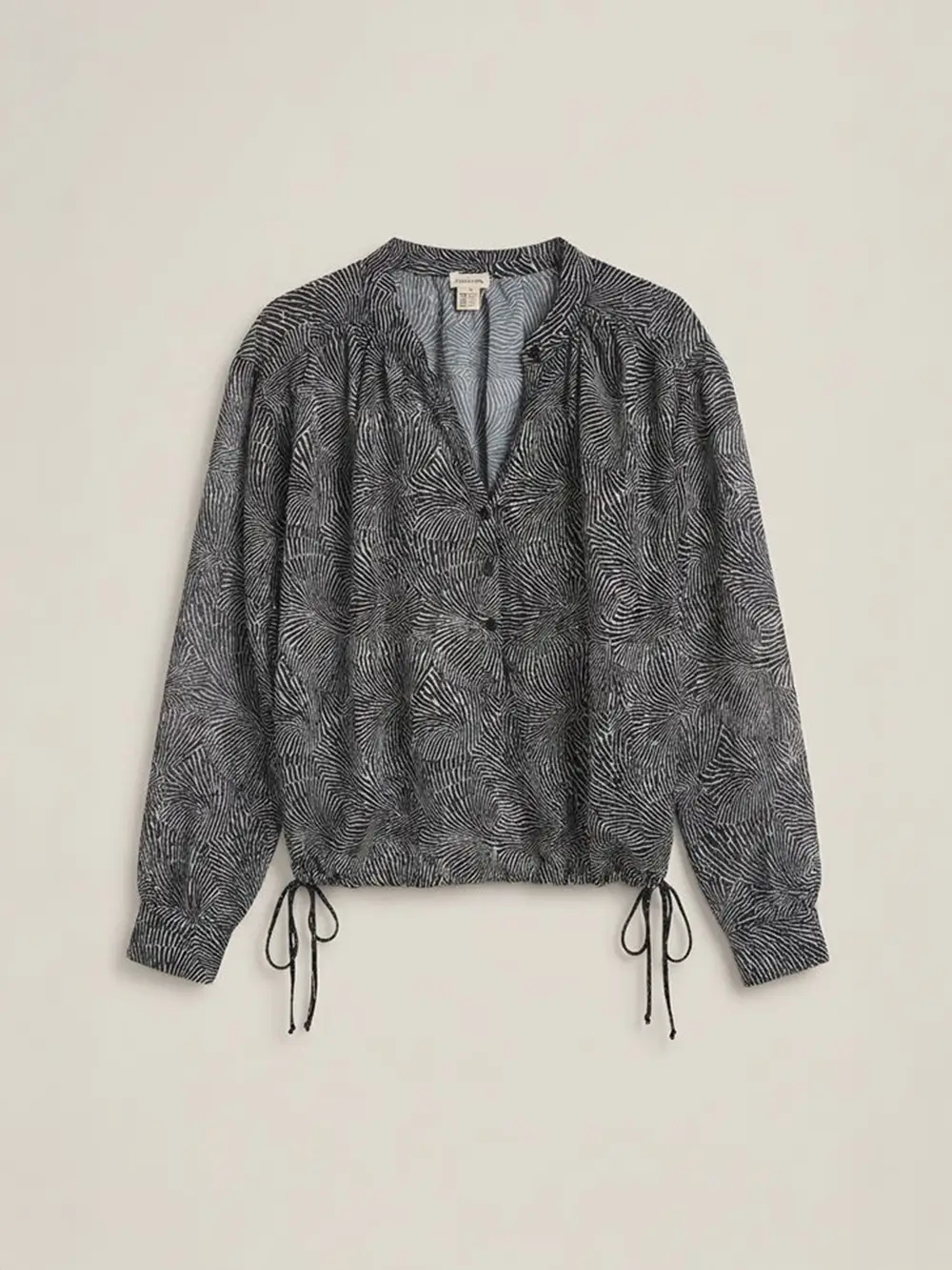 קפלים עדינים באזור הכתפיים והצווארון מוסיפים נפח עדין ונשיות, והשרוולים הארוכים מסתיימים במפתח צר עם כפתור.