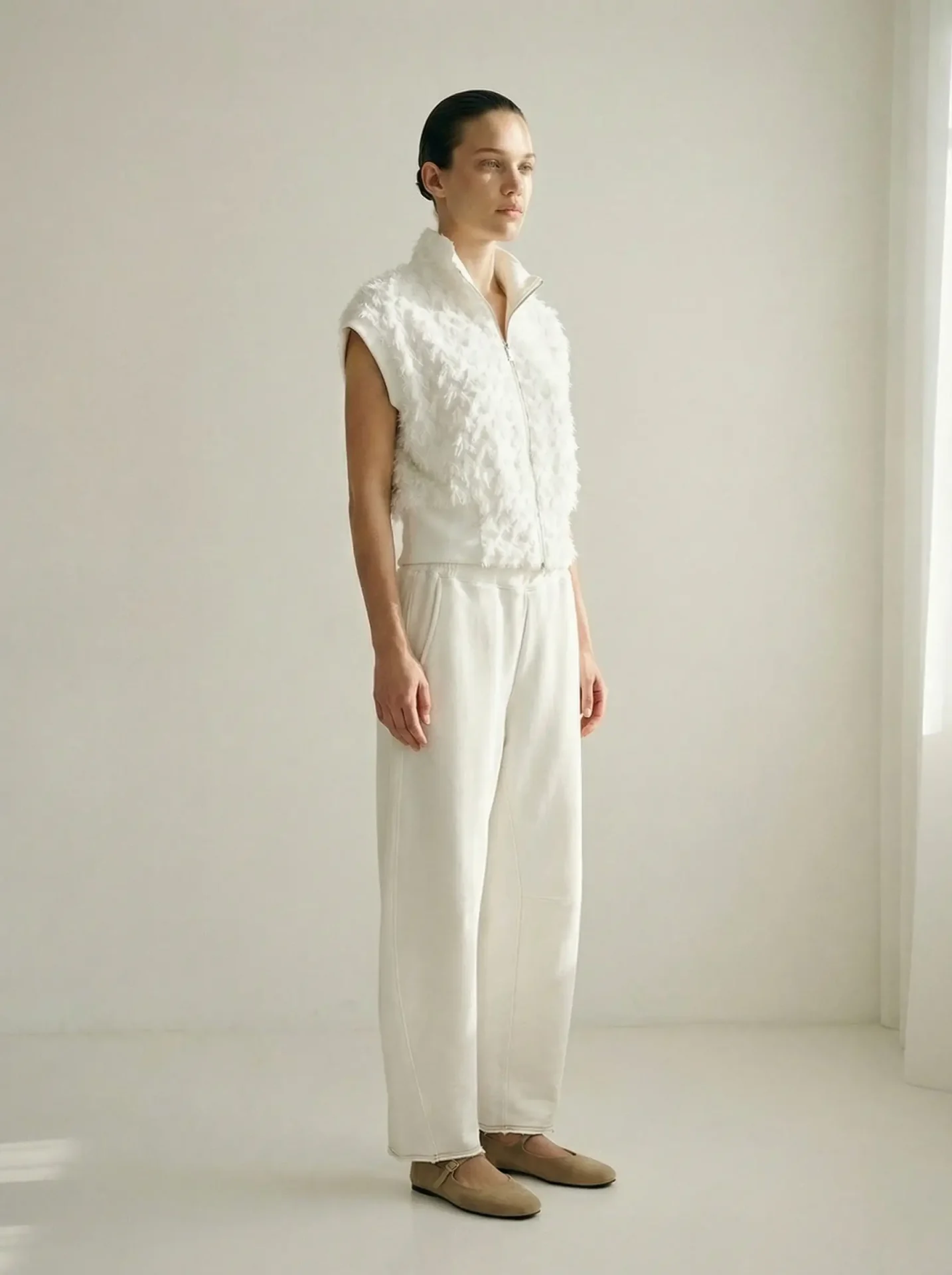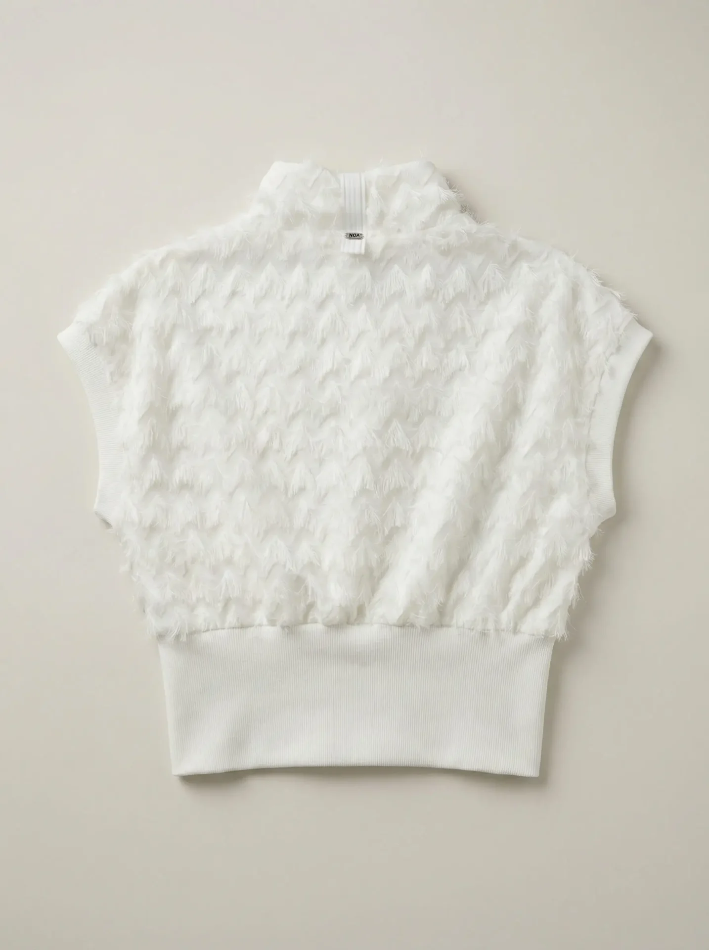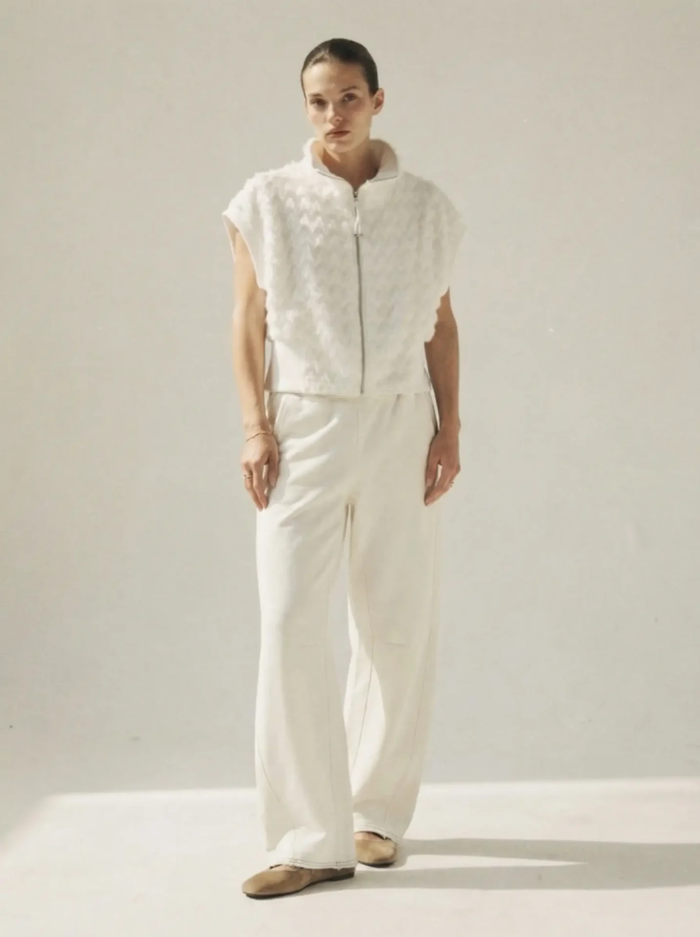 וסט קצר בגזרה משוחררת ונינוחה, עשוי בד טקסטורלי עשיר המעניק עומק ותנועה למראה. העיצוב משלב בין חומריות בולטת לסילואטה נקייה, ליצירת פריט עם נוכחות אך תחושת קלילות.