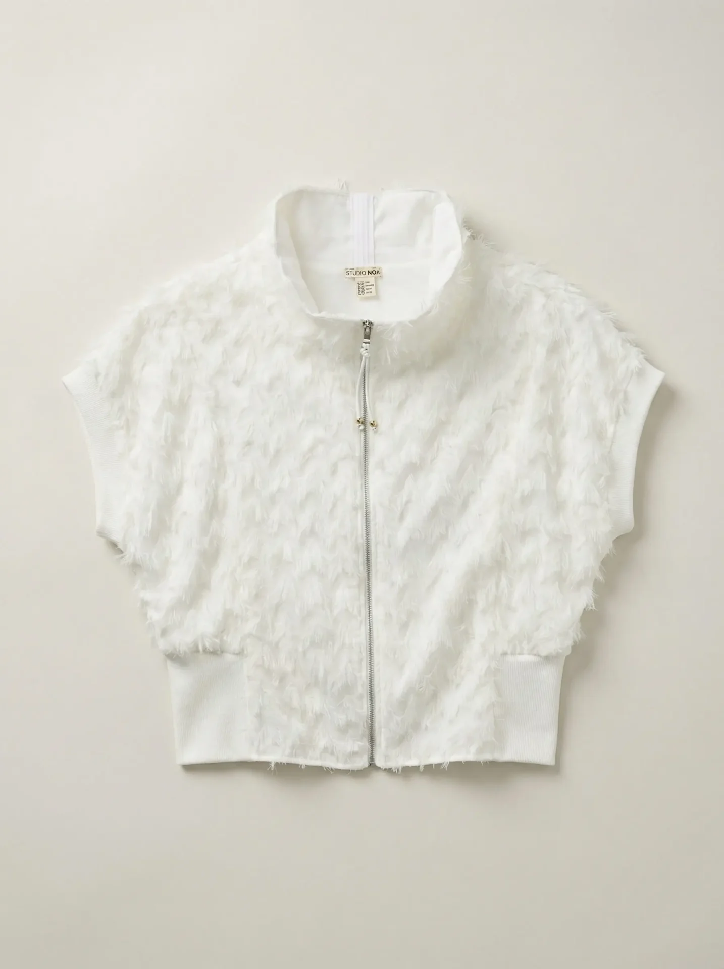 הדגם כולל צווארון עומד, רוכסן קדמי עם תליון עדין וסיומות ריב רחבות בשוליים ובשרוולים, המייצרות מבנה מחמיא ואיזון בין רכות לאיסוף. השרוולים הקצרים יוצרים קו כתף רגוע ומודרני, והגזרה הקצרה מדגישה את הקו הנקי והעכשווי של הפריט.