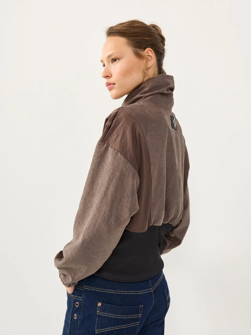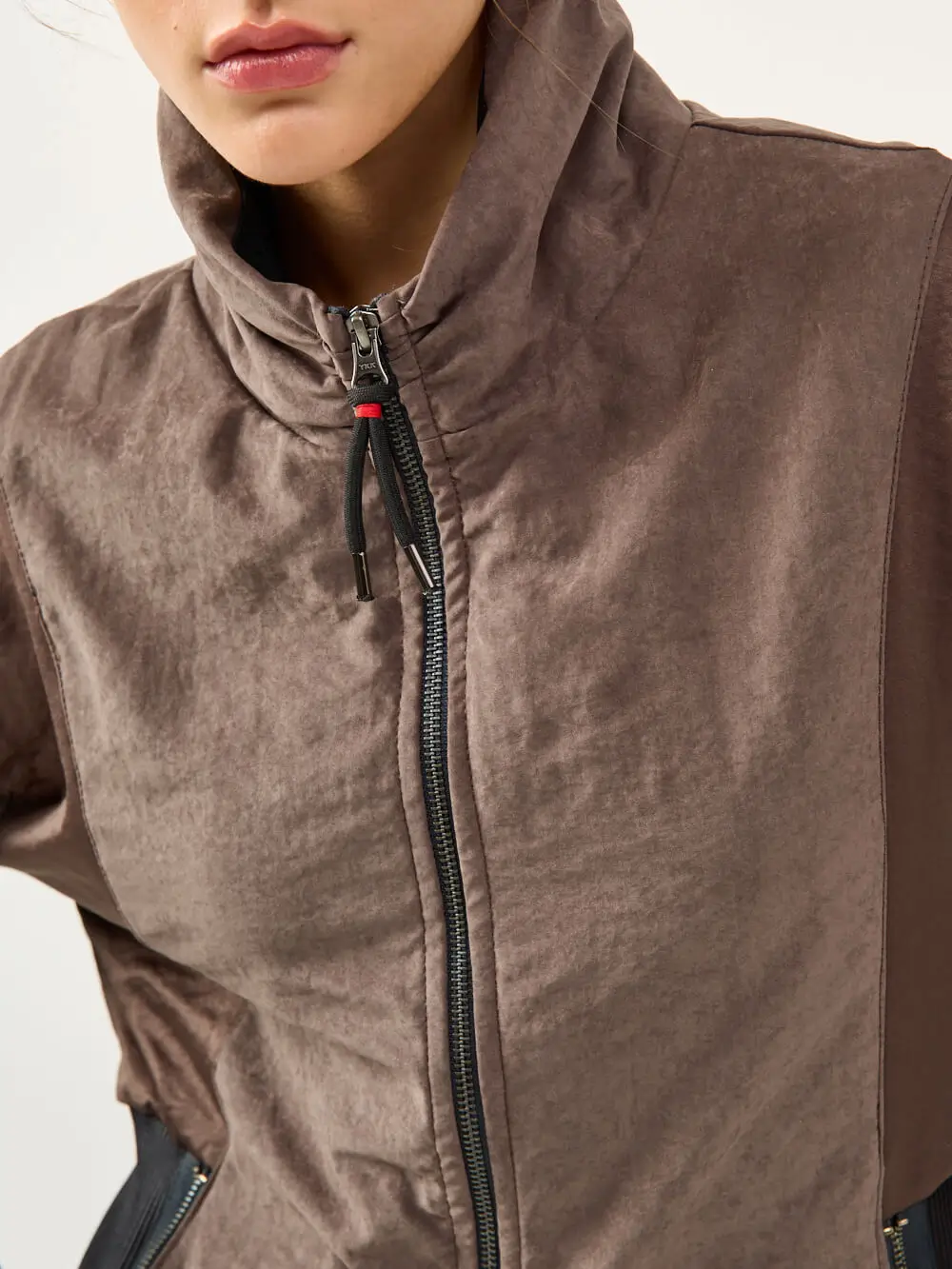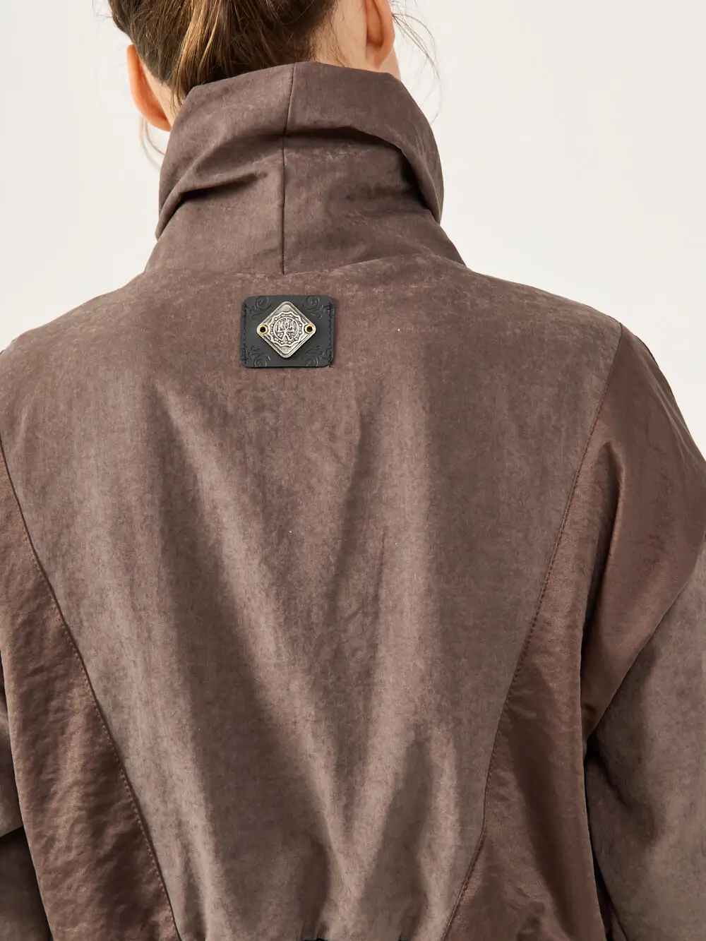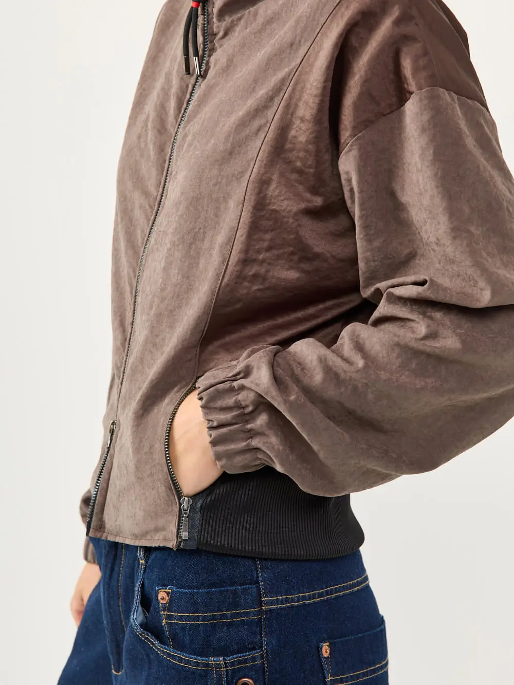 הדגם כולל צווארון גבוה, סגירת רוכסן קדמית כפולה וגומי עדין במותן ובשרוולים – לנוחות מושלמת ולסילואטה מחמיאה.