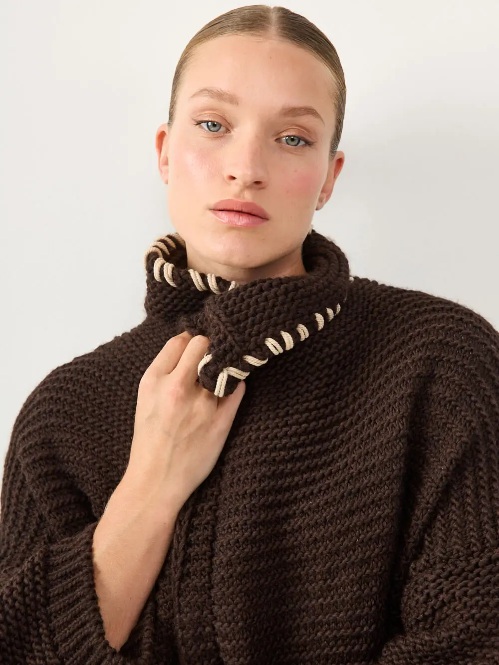 הדיטייל הבולט – עיטורי קשירות עור ידניות סביב הצווארון הרחב – מוסיף עומק ועבודת יד מדויקת, היוצרת מראה ייחודי ומלא נוכחות.
