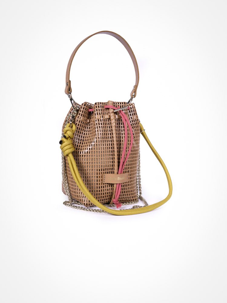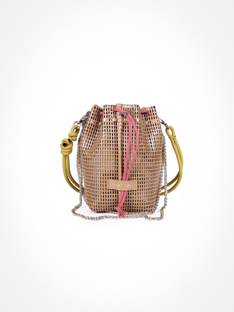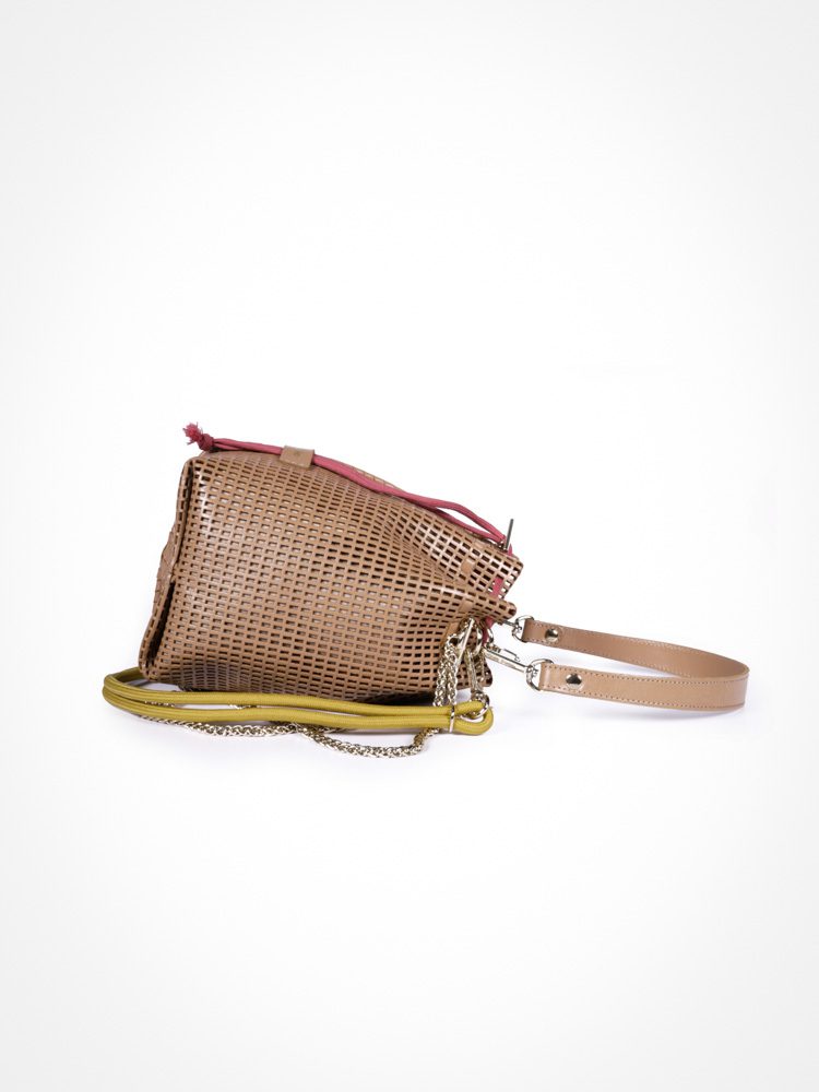 נוצר מעור אחד, מקופל בעדינות ותפור ביד עם רצועת עור. עור הכבשה בצבע זהב בהיר מודבק לציפוי של עור טבעי צמחי, ולאחר מכן מחורר עם ריבועים קטנים להשגת אפקט של תיק רך ואוורירי.