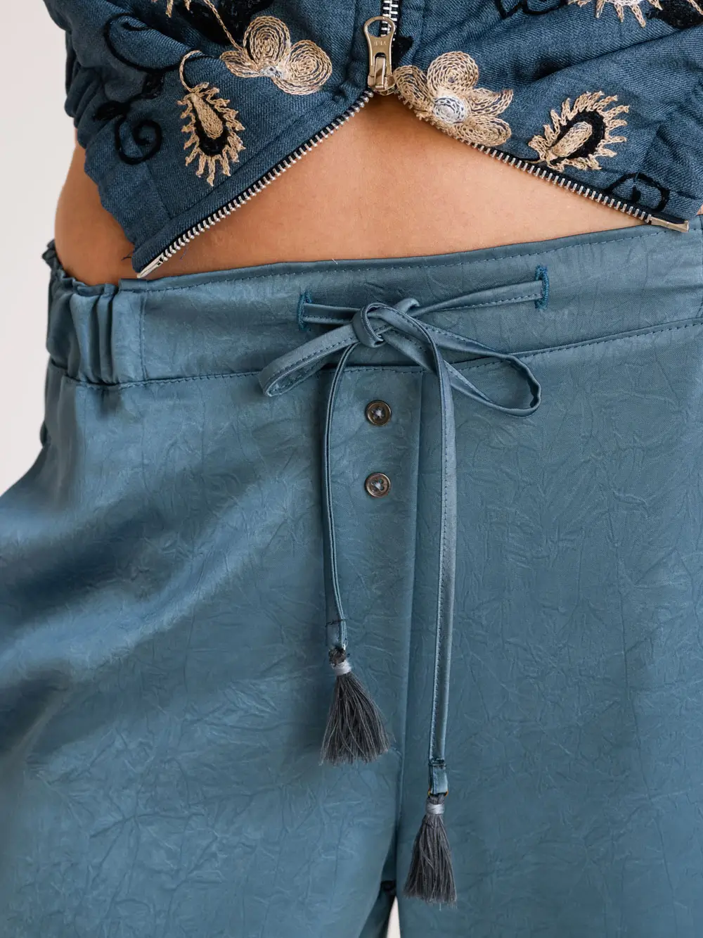 מכנסיים בגזרה ישרה וארוכה מבד סאטן עם ברק עדין ומרקם טקסטורלי רך, היוצרים מראה אלגנטי אך נינוח. הדגם כולל מותן אלסטית נוחה עם שרוך קשירה וגדילי קישוט, בשילוב סגירת כפתורים קדמית עדינה שמוסיפה עניין וייחוד.