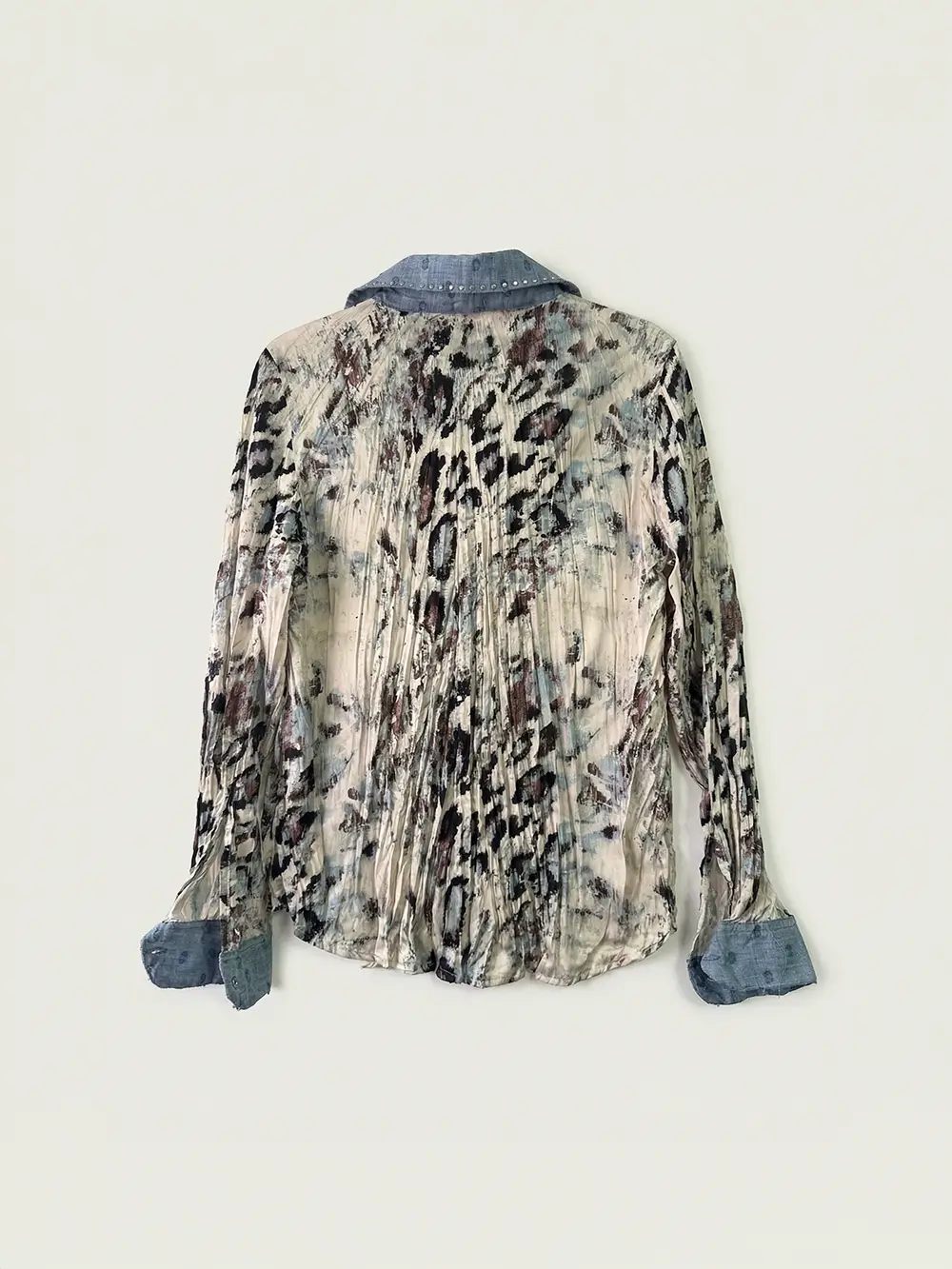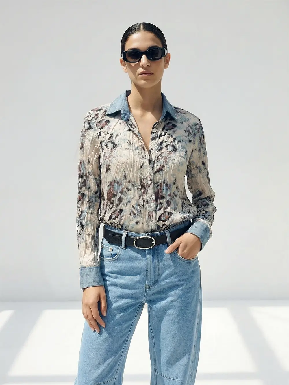 חולצה מכופתרת מקומטת מבד סאטן משי, בהדפס ארטיסטי ייחודי בשילוב דנים עם דיטייל נקודות.