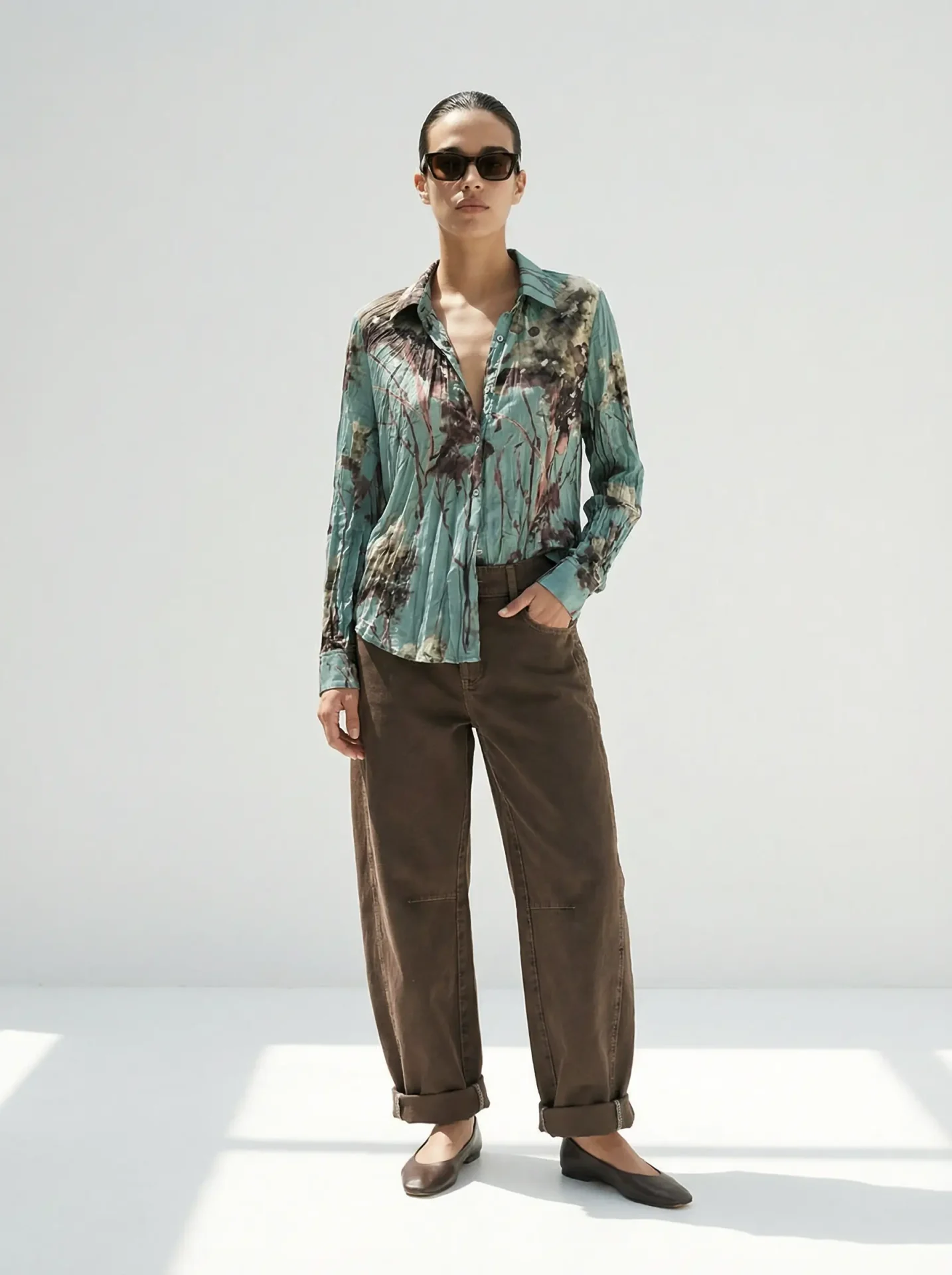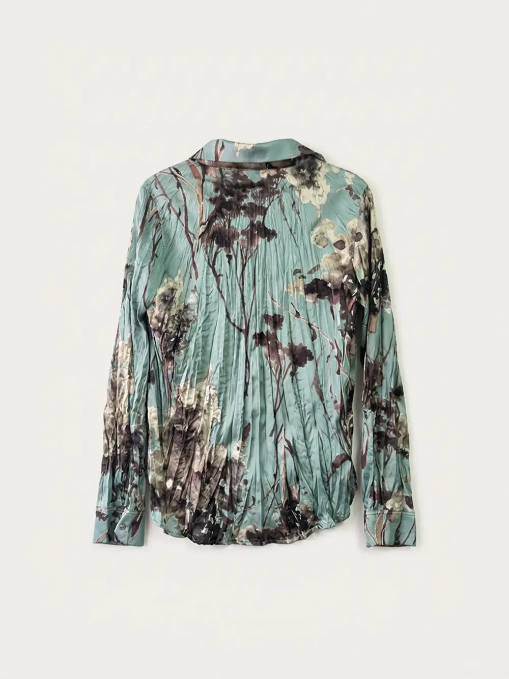 חולצה מכופתרת מקומטת מבד סאטן משי, בהדפס פרחוני בגווני ירוק מרווה.