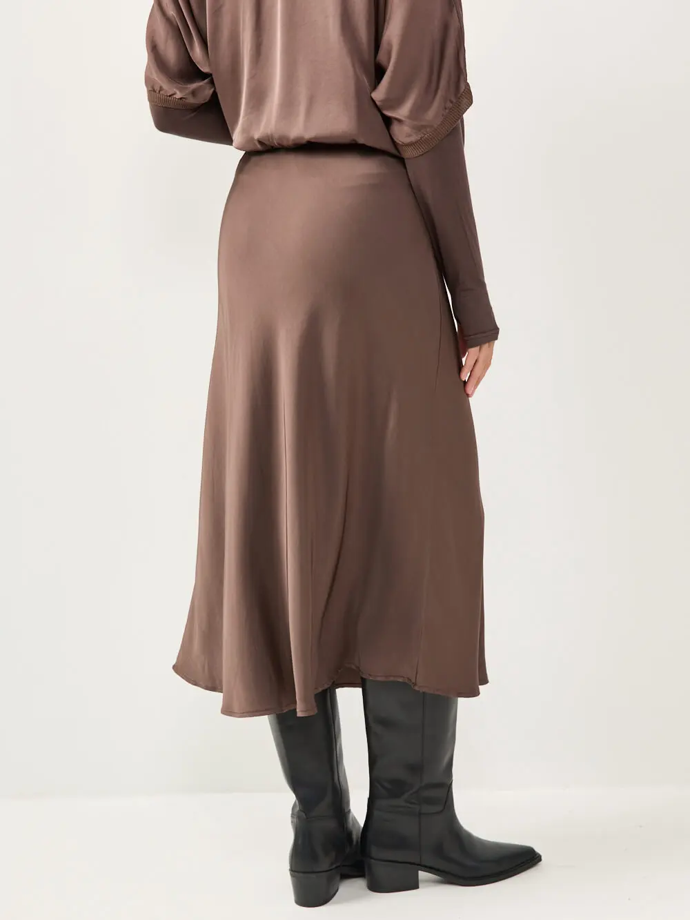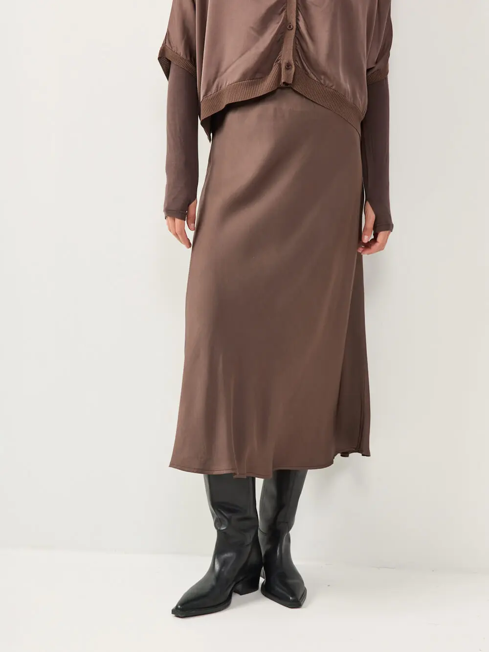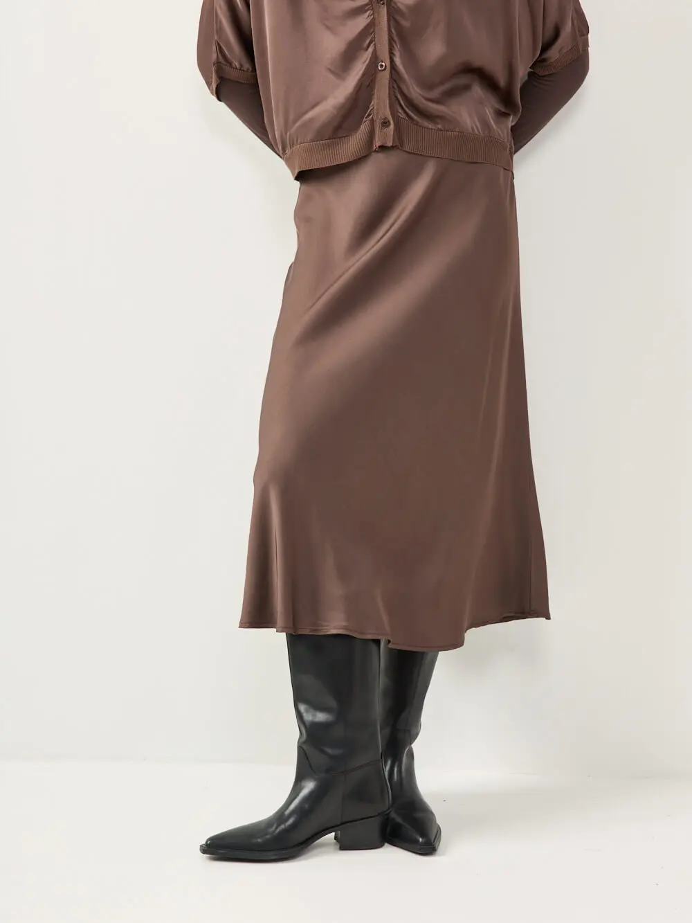 חצאית מידי מבד סאטן משי בגימור מבריק ועדין. גזרת אלכסון שמחמיאה לקו הגוף ומדגישה את התנועה.