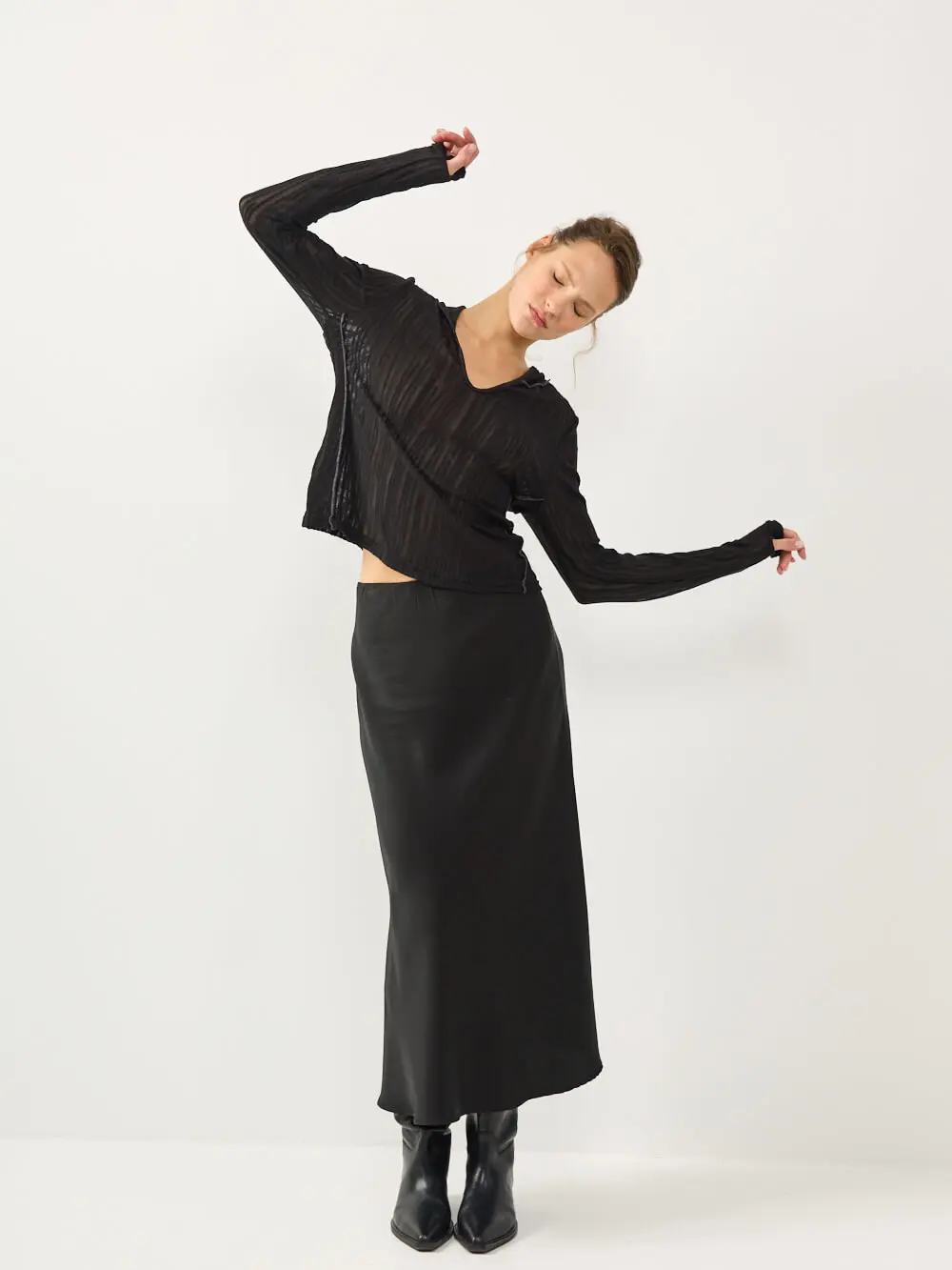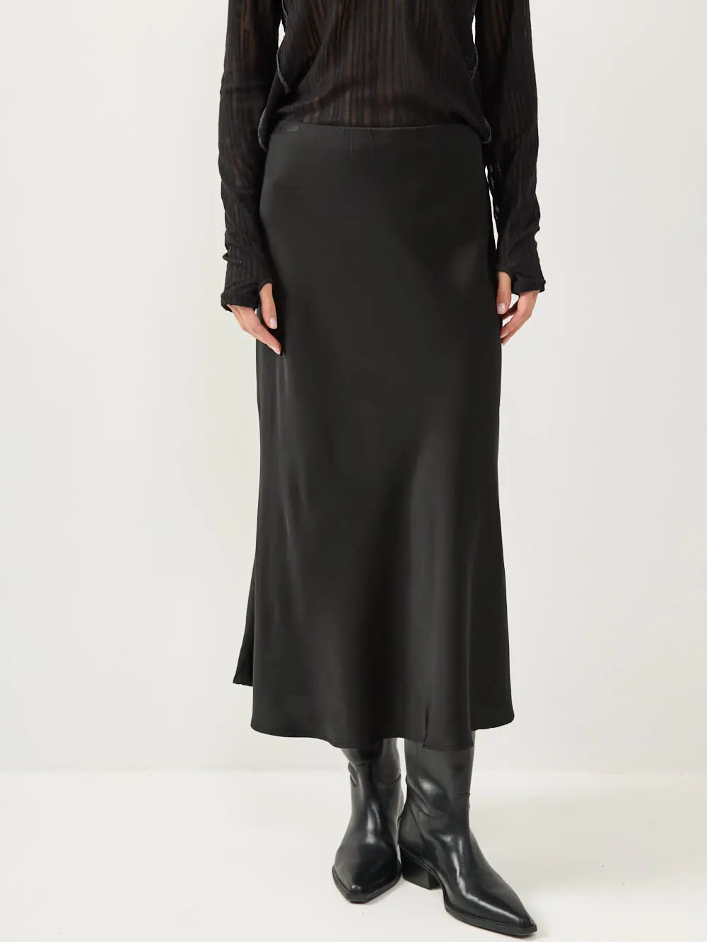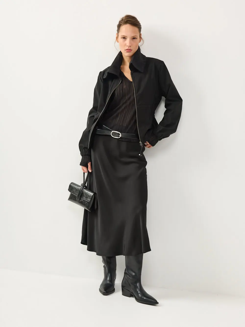 חצאית מידי מבד סאטן משי בגימור מבריק ועדין. גזרת אלכסון שמחמיאה לקו הגוף ומדגישה את התנועה.