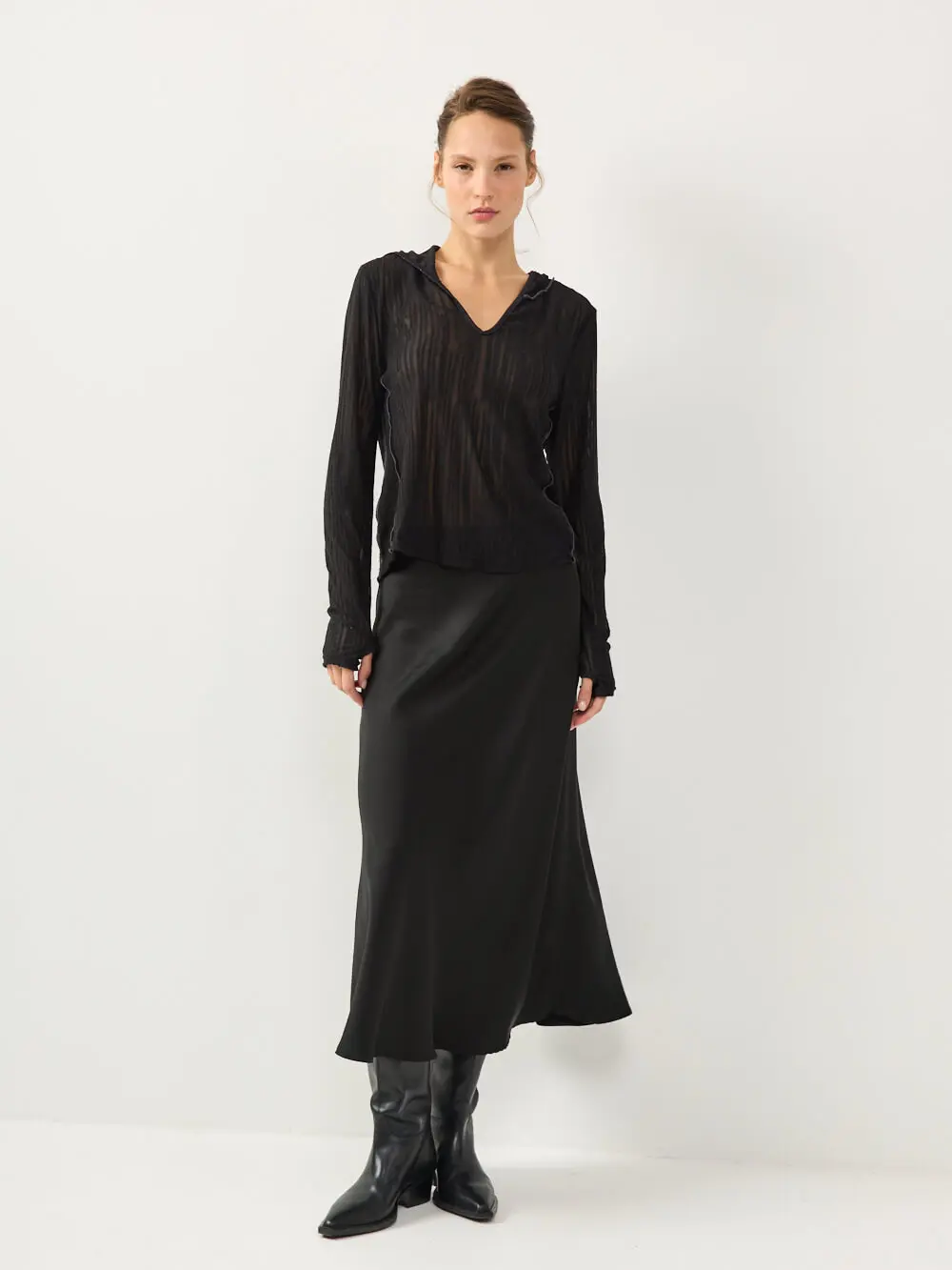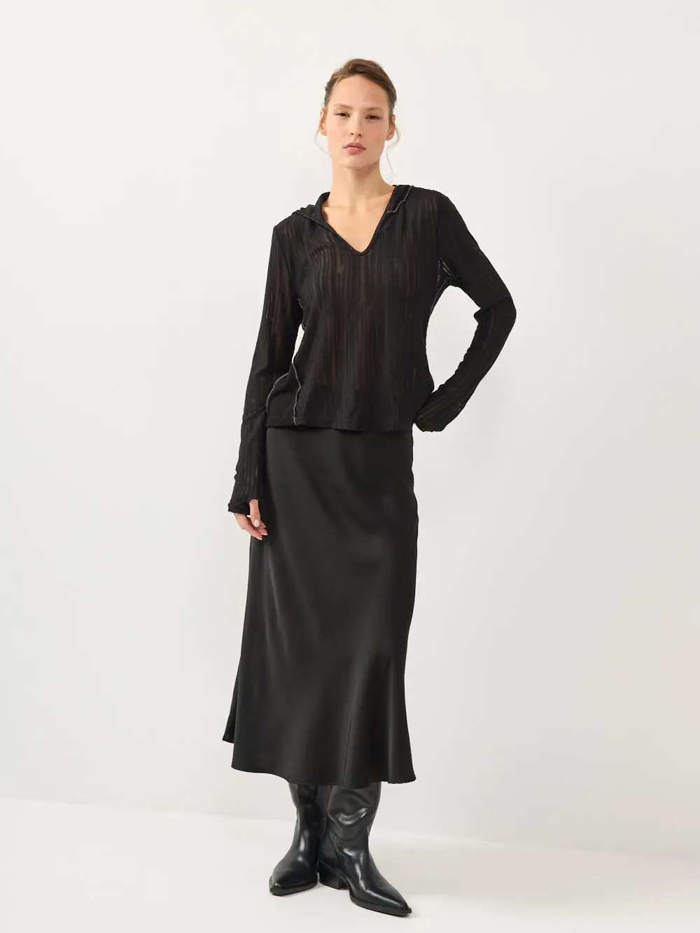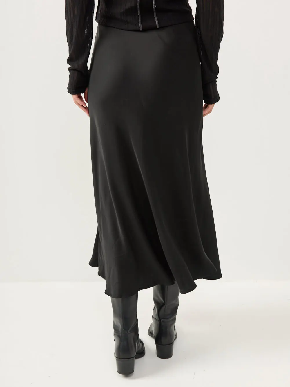 חצאית מידי מבד סאטן משי בגימור מבריק ועדין. גזרת אלכסון שמחמיאה לקו הגוף ומדגישה את התנועה.