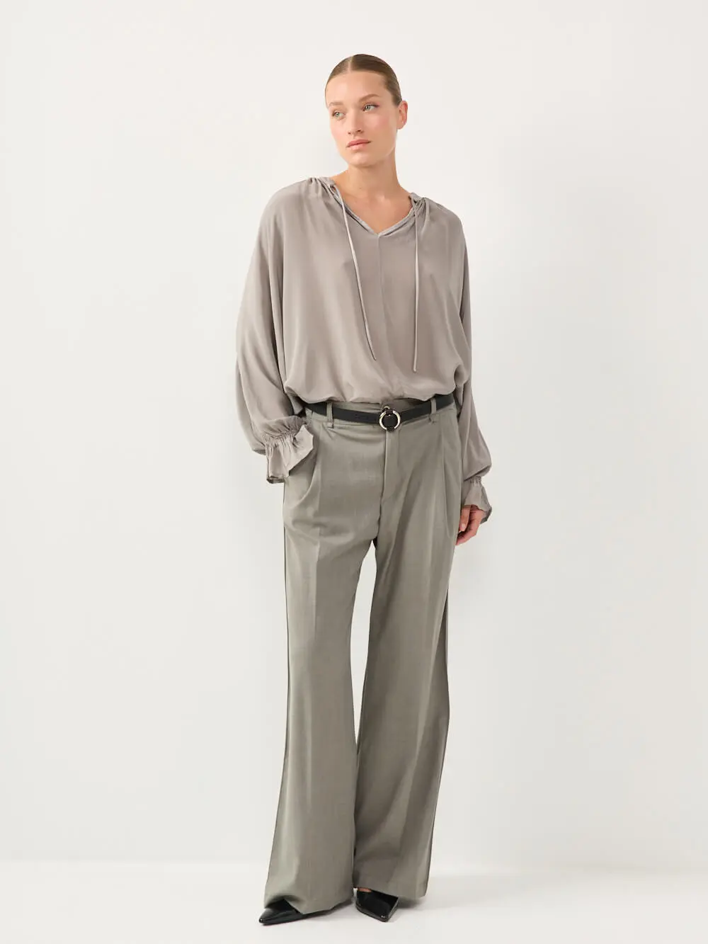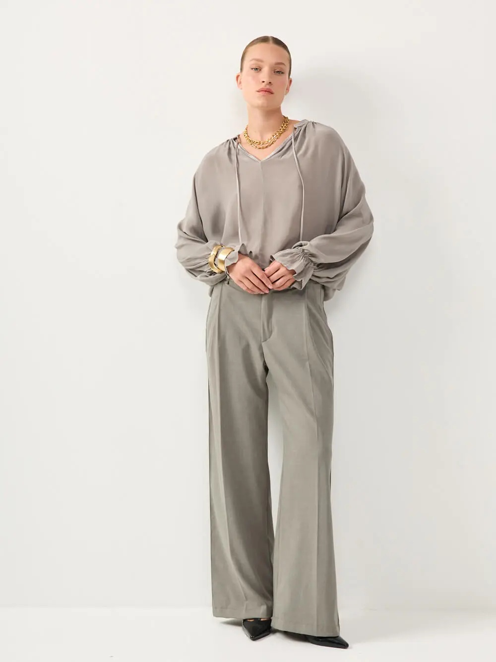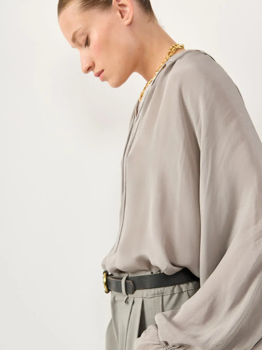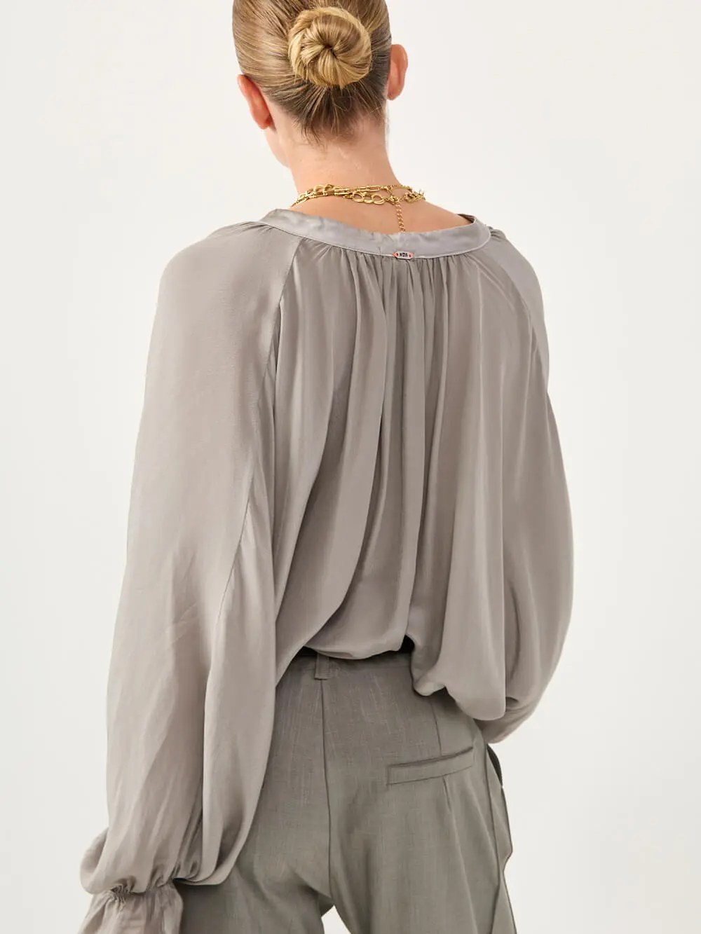 חולצה מבד סאטן משי רך ונעים למגע, בגזרה שופעת ונינוחה.