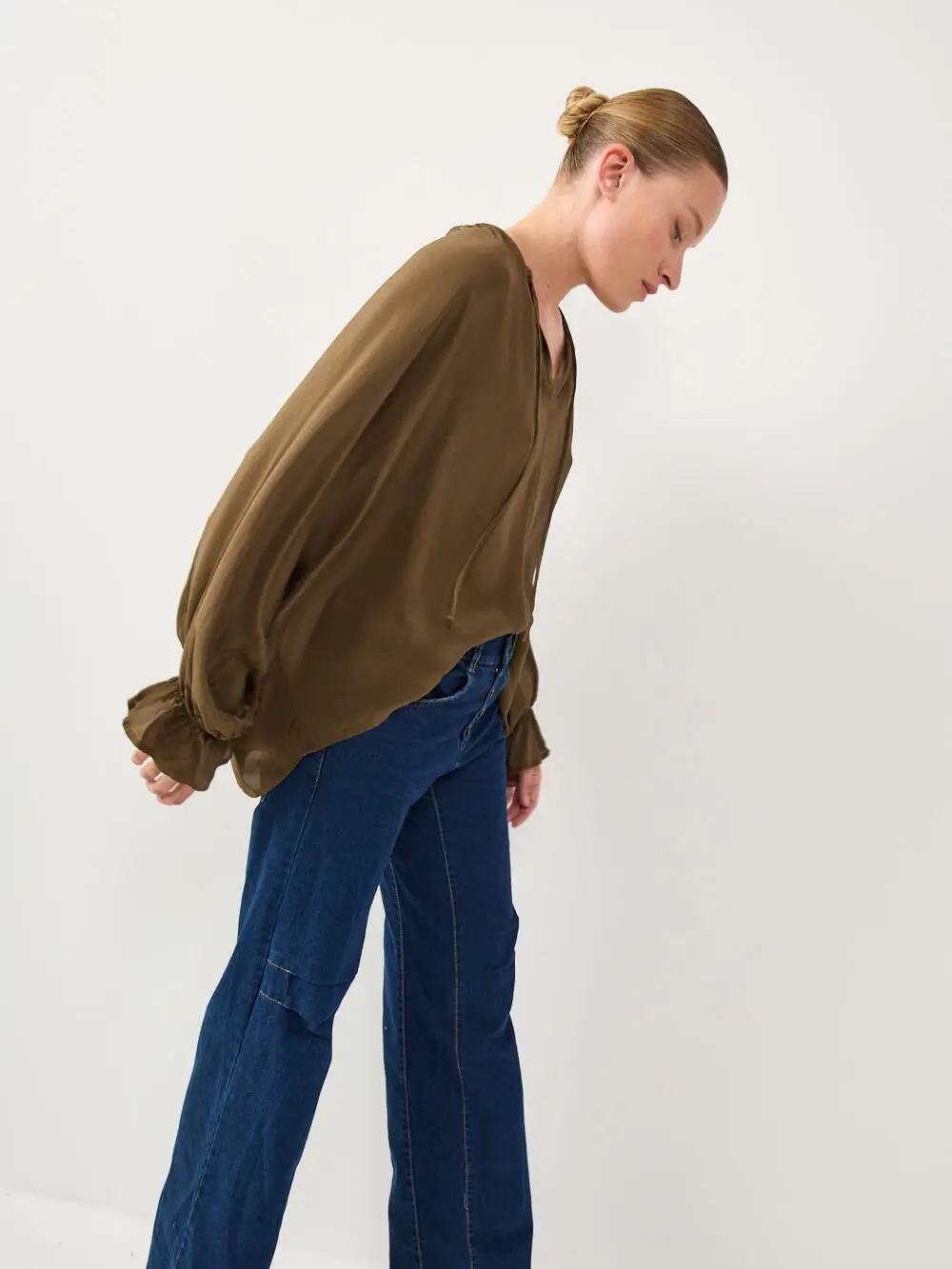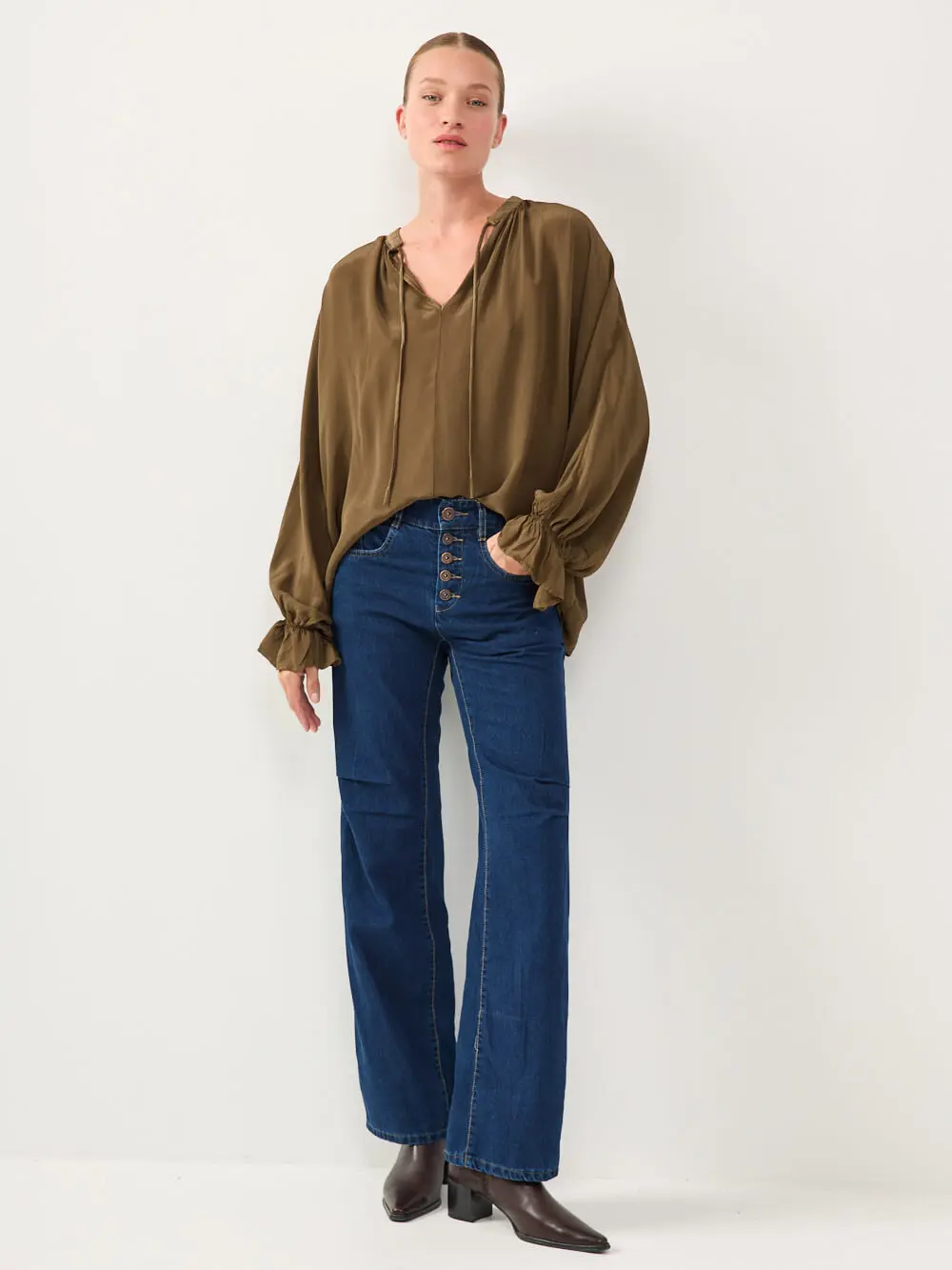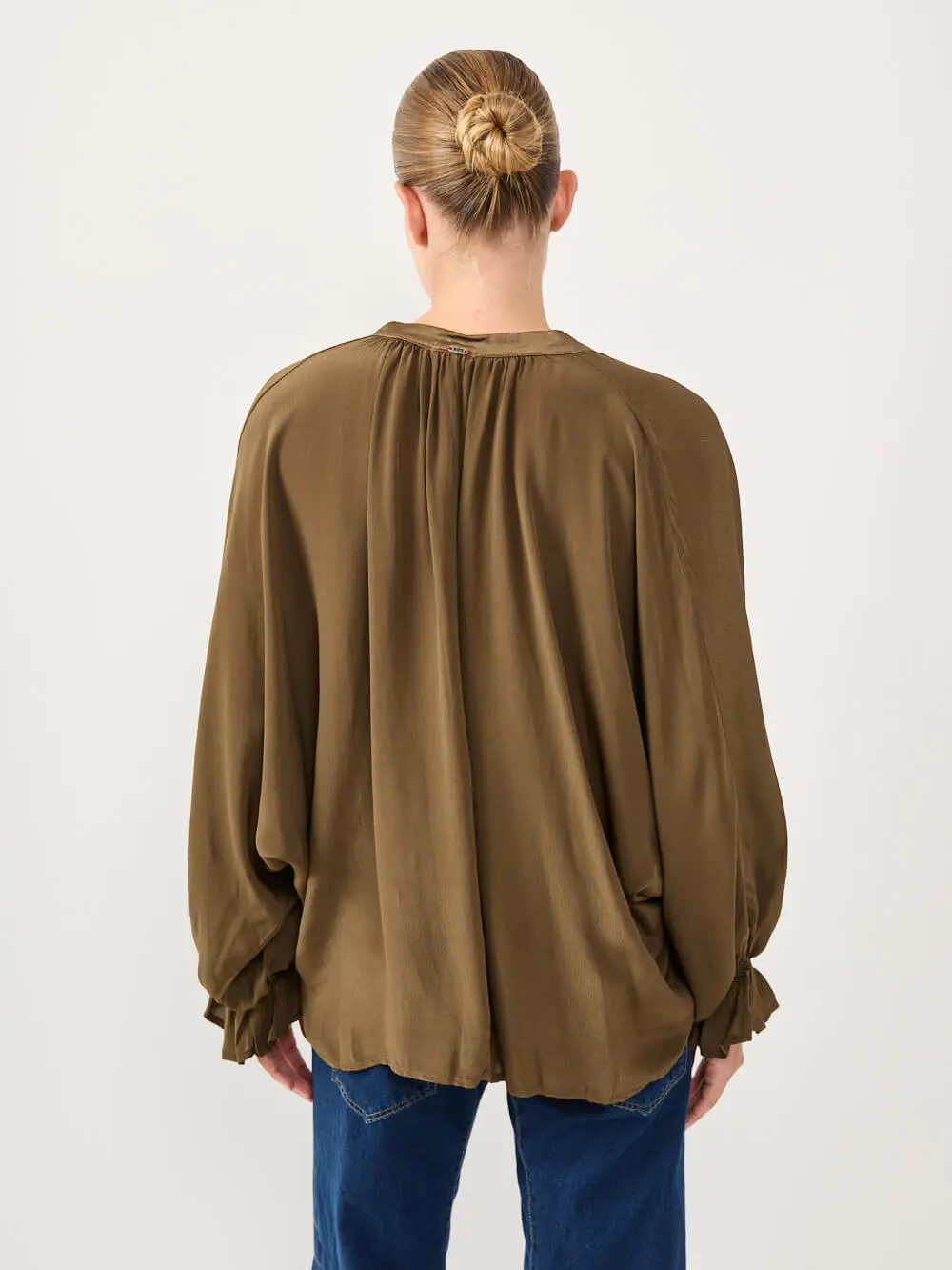חולצה מבד סאטן משי רך ונעים למגע, בגזרה שופעת ונינוחה.