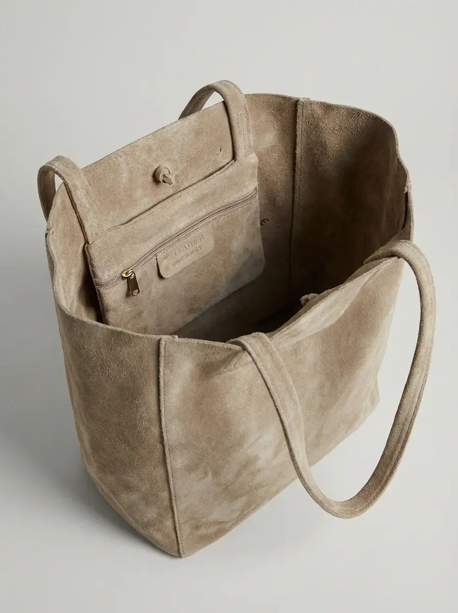 תיק שופינג גדול ומרווח בעיצוב קלאסי, עשוי 100% זמש איטלקי איכותי, עשוי עור אמיתי בגימור רך ונעים למגע.