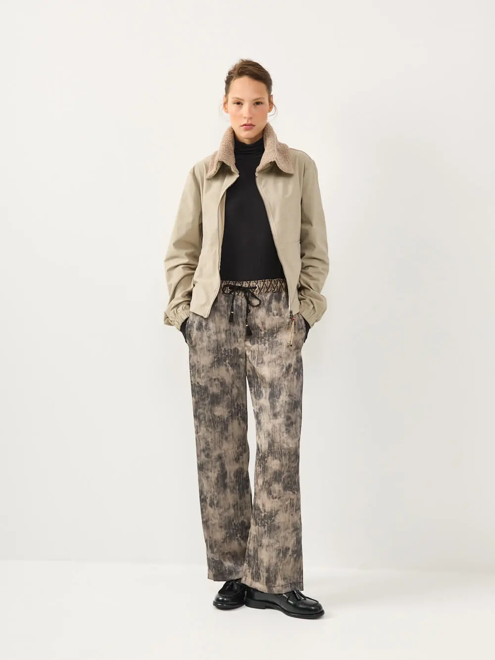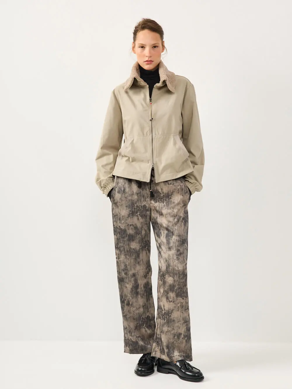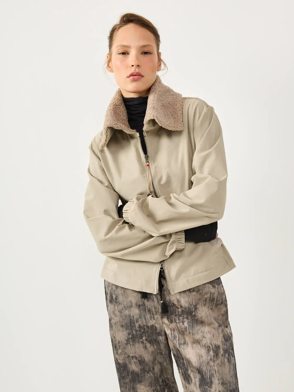 כולל צווארון גבוה, סגירת רוכסן כפולה וכיוונון עדין במותן ליצירת מבנה מדויק ומחמיא.